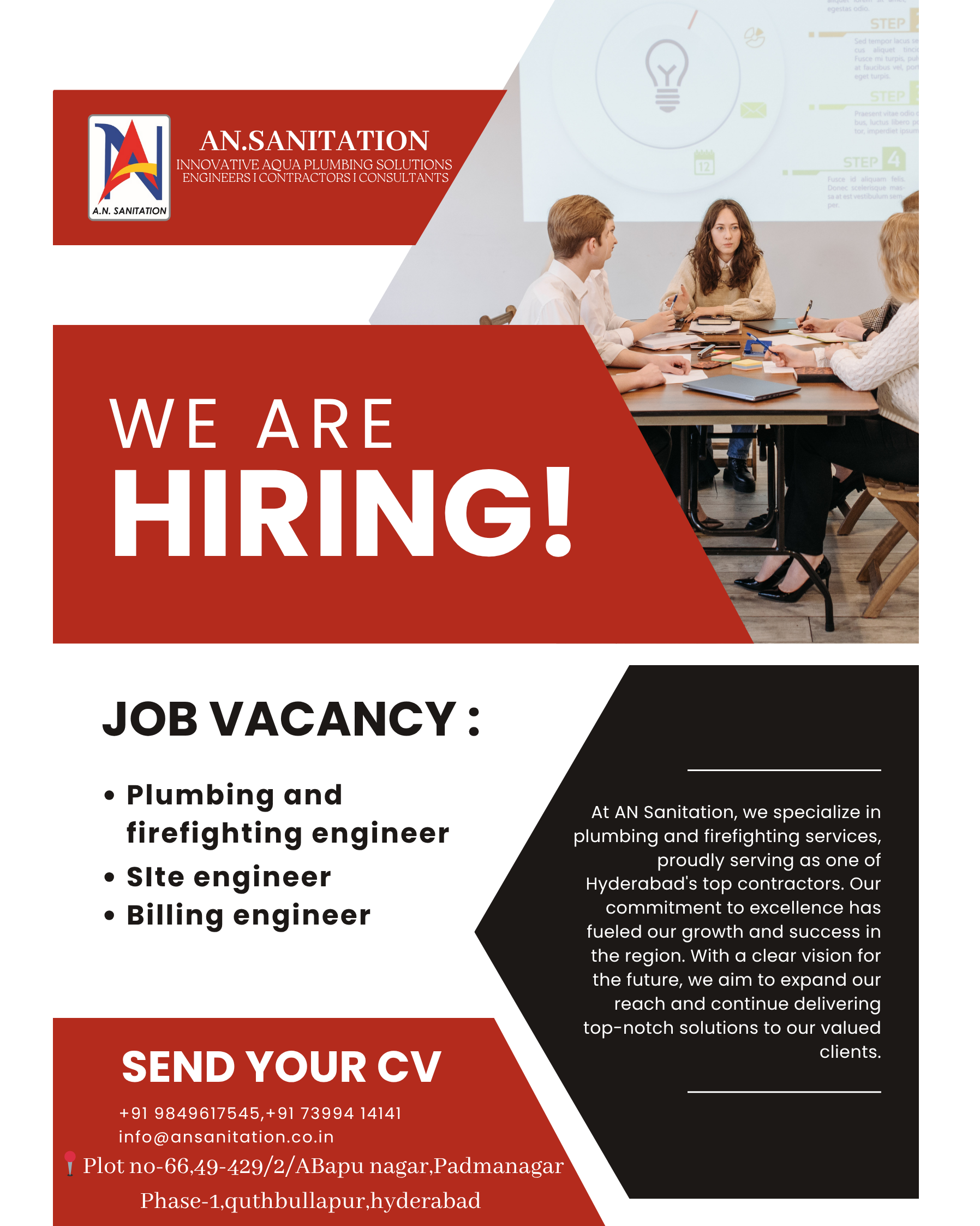 We're Hiring! Join the AN Sanitation Team We’re expanding our dynamic team and currently have openings for the following positions: ✅ Plumbing and Firefighting Engineer ✅ Site Engineer ✅ Billing Engineer If you're passionate about quality, innovation, and growth in the plumbing and firefighting industry, we’d love to hear from you. 📩 Send your CV to: info@ansanitation.co.in 📍 Location: Padmanagar, Quthbullapur, Hyderabad Be a part of one of Hyderabad’s top contracting firms. Let’s build the future together!